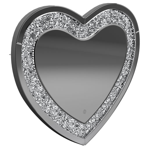 This heart-shaped wall mirror adds sparkle and function to glam-inspired spaces. Framed with mirrored glass and outlined by faceted acrylic crystal inlay, it delivers high-shine appeal. Integrated LED lighting enhances visibility for makeup, grooming, or daily routines. Designed for wall mounting, this decorative mirror combines charm and practicality—ideal for bedrooms, vanities, or dressing areas needing both style and illumination. Key Features: • Wall-mounted heart-shaped mirror designed to double as a decorative and functional piece • Framed in mirrored glass for sleek, high-shine style and glam appeal • Inset acrylic crystal inlay adds sparkle and textural contrast around the border • LED lighting built into the mirror for enhanced visibility during grooming • Ideal for bedrooms, vanities, or personal dressing areas with bold flair • Mounts securely to the wall and adds charm to glam-themed interior spaces