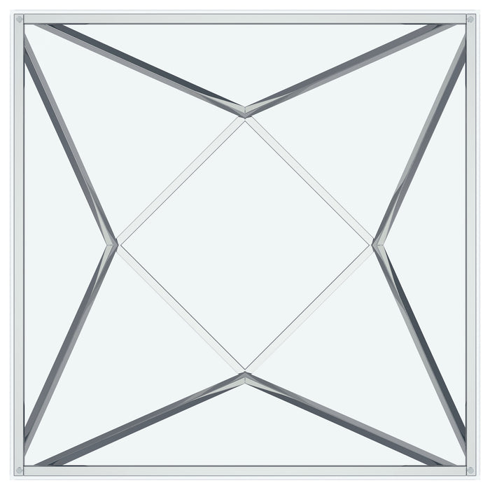 This modern end table showcases a bold geometric base in a polished nickel finish, paired with a durable clear tempered glass top. The tempered glass surface offers scratch resistance and effortless upkeep, while the nickel-finished steel frame ensures lasting stability. Its open framework design brings a contemporary, lightweight aesthetic, ideal for minimalist or industrial-inspired interiors. This versatile accent table blends functionality with style, making it a perfect fit for modern living spaces.