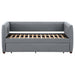 A gray fabric, pleated and overlapping along the surface of this twin daybed and trundle set, create a textured appearance against the clean straight lines. The narrow arms and backrest invite you to get creative with your own accent pillows and throws, opening this furniture piece up to becoming a lounge sofa or a bed for additional overnight guests. A trundle slips beneath the main frame when not in use or can be retrieved and glided out effortlessly. Black finish feet add slight elevation and a pop of contrast against flooring and rugs too. This twin daybed trundle set is the perfect addition for compact, multipurpose spaces like home offices and guestrooms. Key Features: • With its thin, pleated, fabric details, this shelter back daybed features exceptional tailoring throughout • Relax in comfort with this sleeping, lounging, daybed must-have • Perfect for smaller living areas, convenient pull out trundle for extra sleeping space when needed • Upholstered in grey fabric • Frame constructed with pine and MDF • Slat kits included