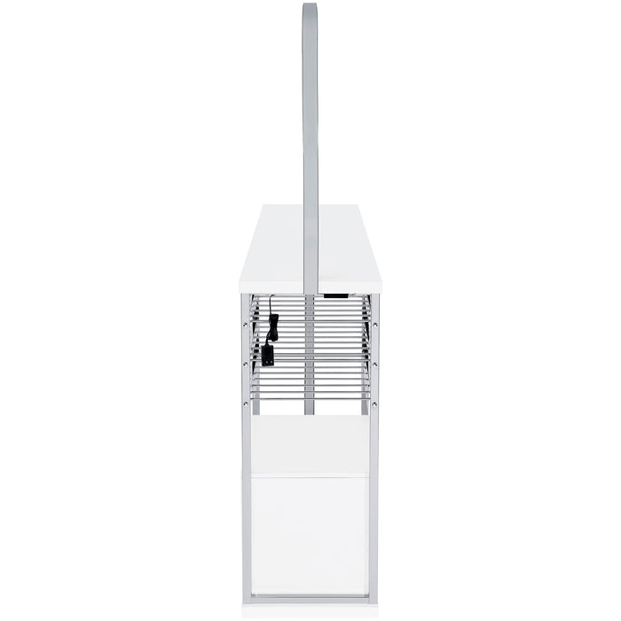Transform your space into a beacon of style with this contemporary wine cabinet that marries function with cutting-edge design. Bathed in the glow of LED lighting with a choice of eight vibrant colors, this piece becomes the centerpiece of any entertainer's haven. The sleek chrome electroplated metal frame supports a durable composite wood tabletop, perfect for hosting an array of glasses and spirits. Below, a two-door cabinet conceals essentials, while three tiers cradle up to 21 bottles of your finest wine. With a built-in stemware rack, this bar doesn't just store your collection, it showcases it, making every occasion a toast-worthy affair. Key Features: • Contemporary wine cabinet with customizable LED lighting featuring 8 color options • Chrome electroplated metal frame with durable composite wood tabletop • Integrated 3-tier bottle storage accommodating up to 21 bottles • Built-in stemware rack for glassware organization • Two-door cabinet for additional storage and streamlined appearance